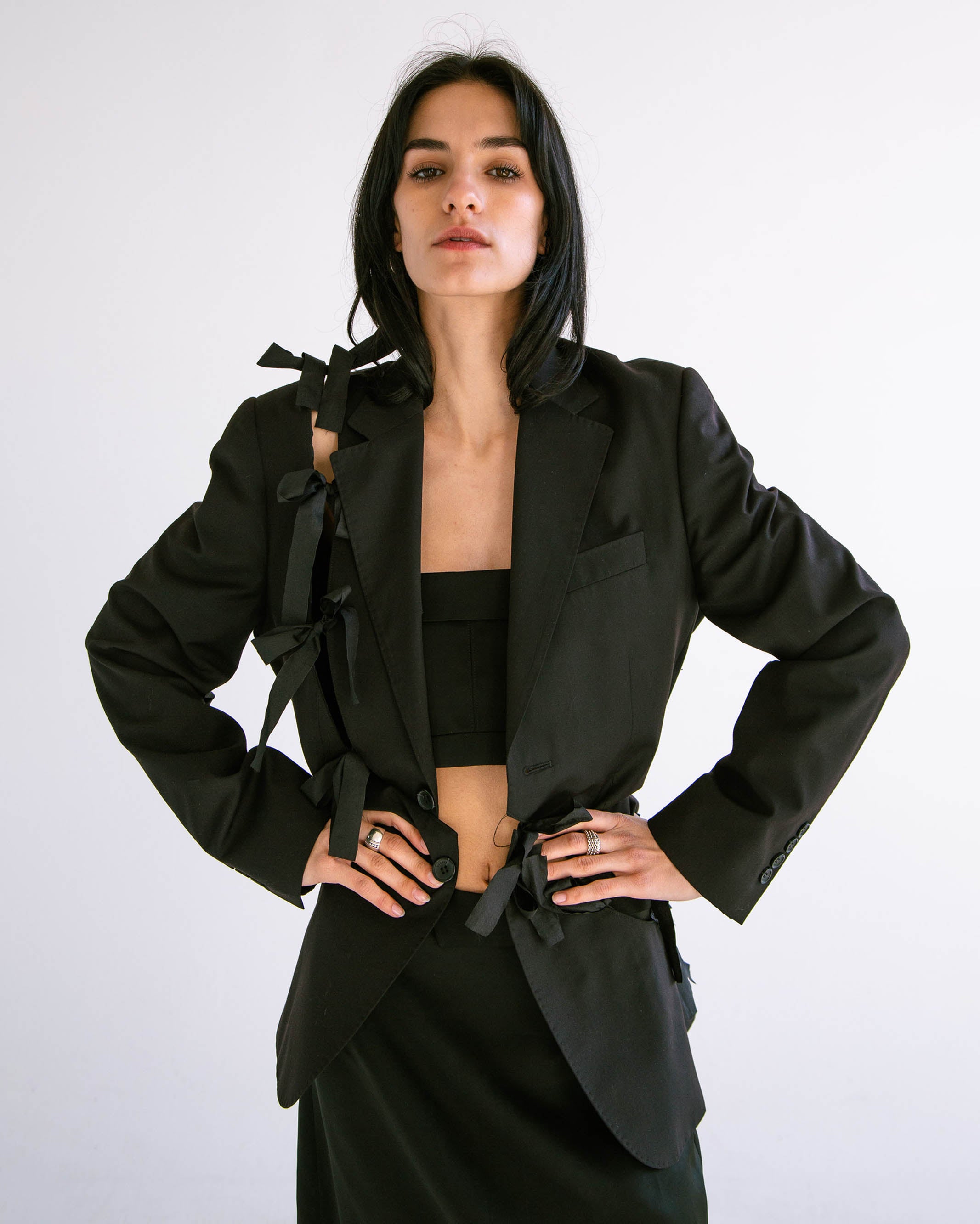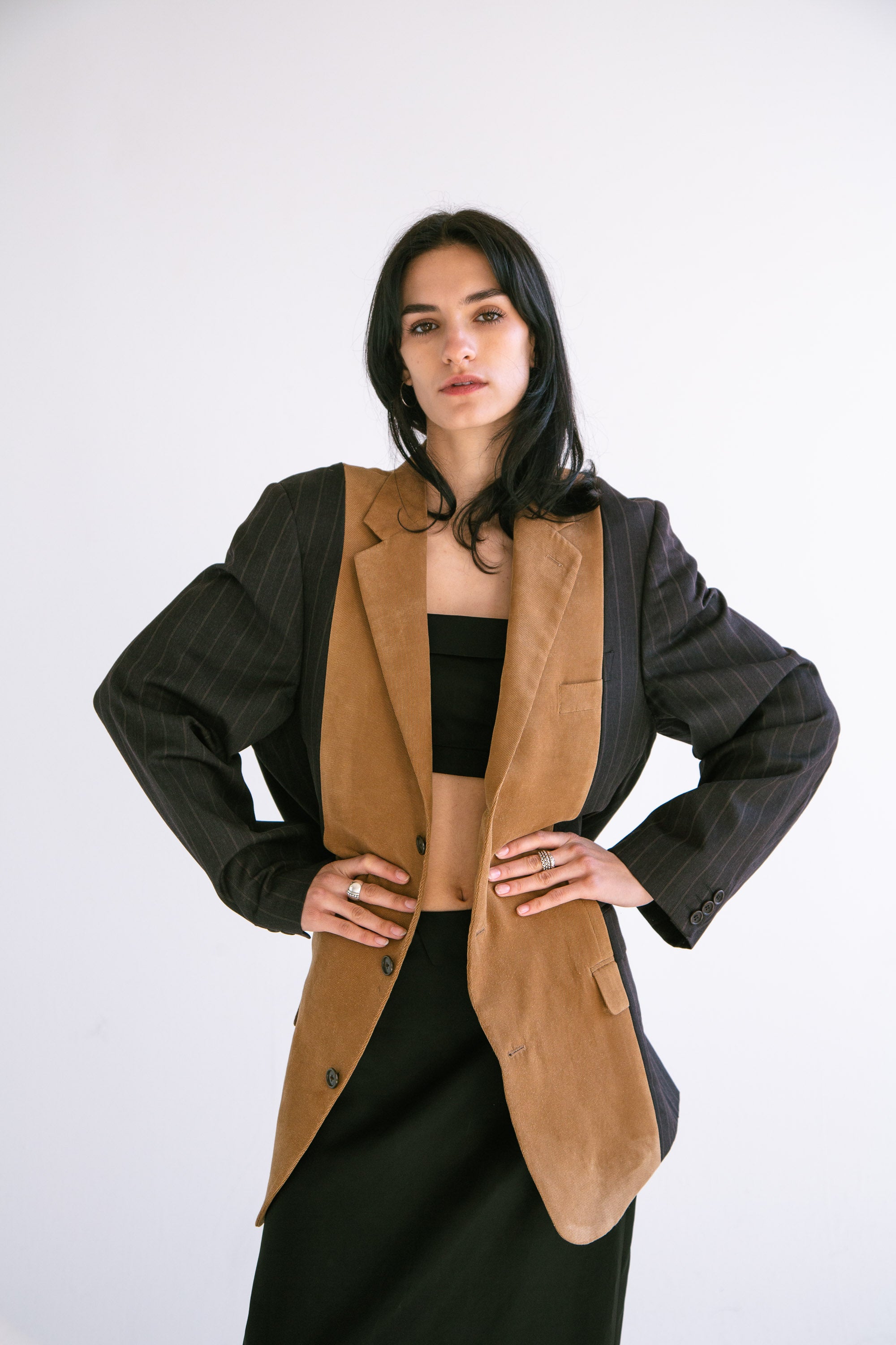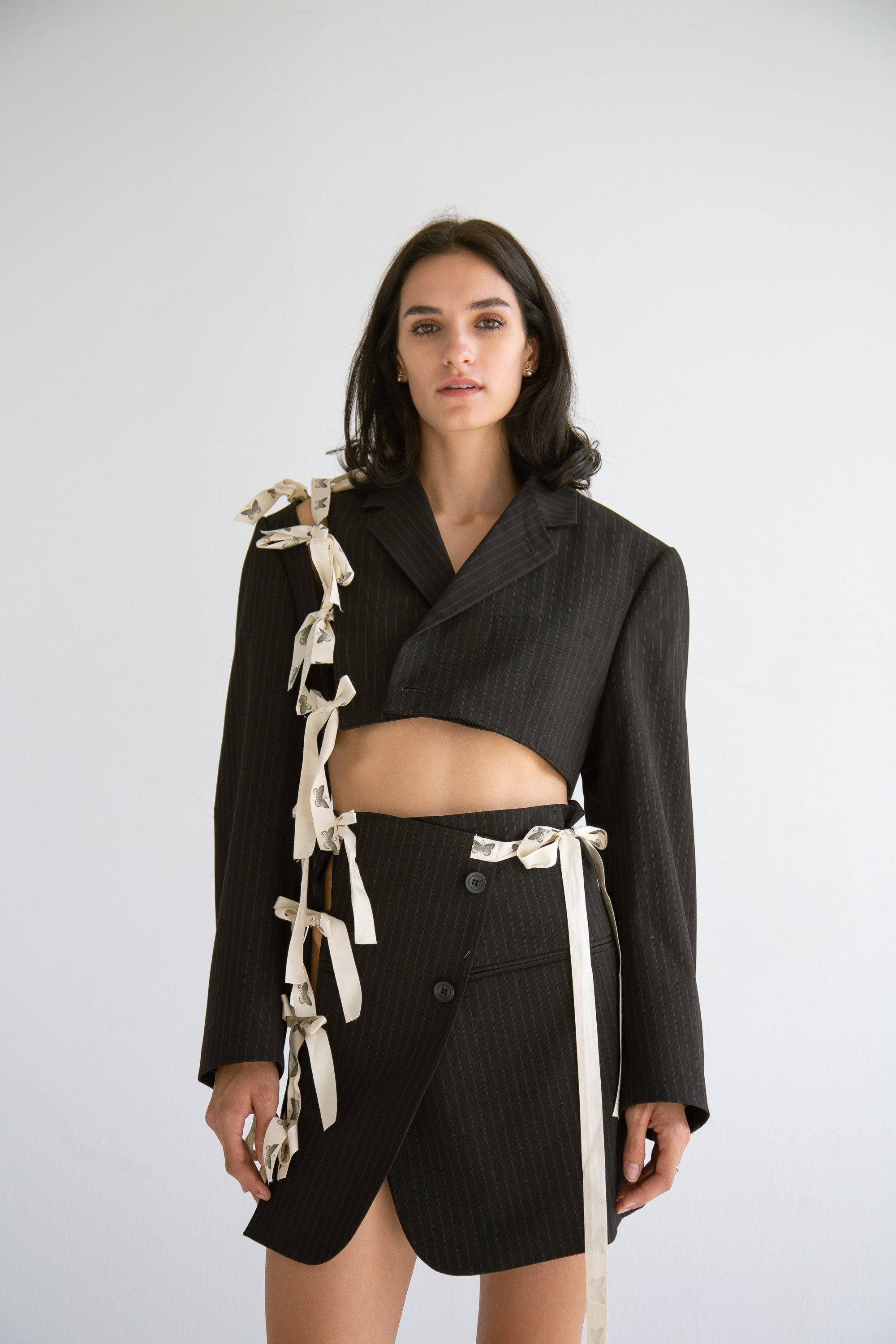 At Y-Y, we focus on reducing production waste by upcycling materials to create unique garments in timeless silhouettes. We actively source pre-existing textiles from overproduced garments, deadstock fabric runs, and vintage designer items.